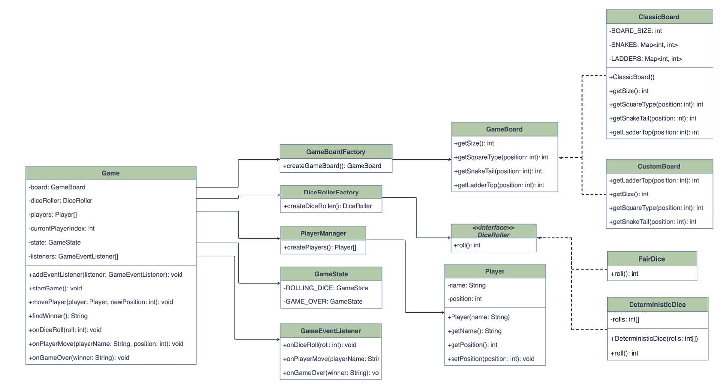 Additionally, the strategy pattern defined various gameplay mechanics, allowing for different rule sets or game modes without altering the core logic. It encapsulates different strategies for moving players (different dice roll strategies ), ensuring seamless adaptation to different versions of the game.